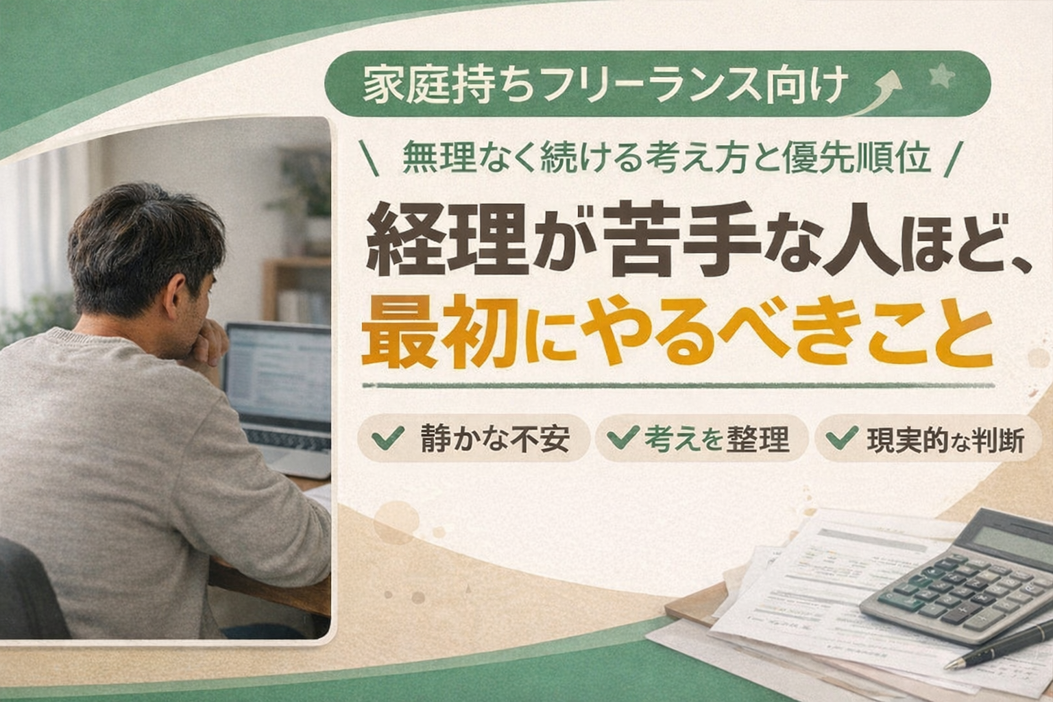 経理が苦手な人が最初にやるべきことは、知識を増やすことでも、完璧な管理を目指すことでもありません。まずは、不安の正体を整理し、最低限見るべきお金を決め、自分でやる範囲と任せる範囲をはっきりさせることです。家庭を持ちながら事業を続けていると、経理にかけられる時間や気力には限りがあります。無理に頑張り続けるより、「続けられる形」を優先した方が、結果的に安定します。この先どう進むかは人によって違います。手作業で続ける人もいれば、ツールを使う人、専門家に任せる人もいます。大切なのは、自分の時間や家族への影響を含めて、納得できる選択をすることです。